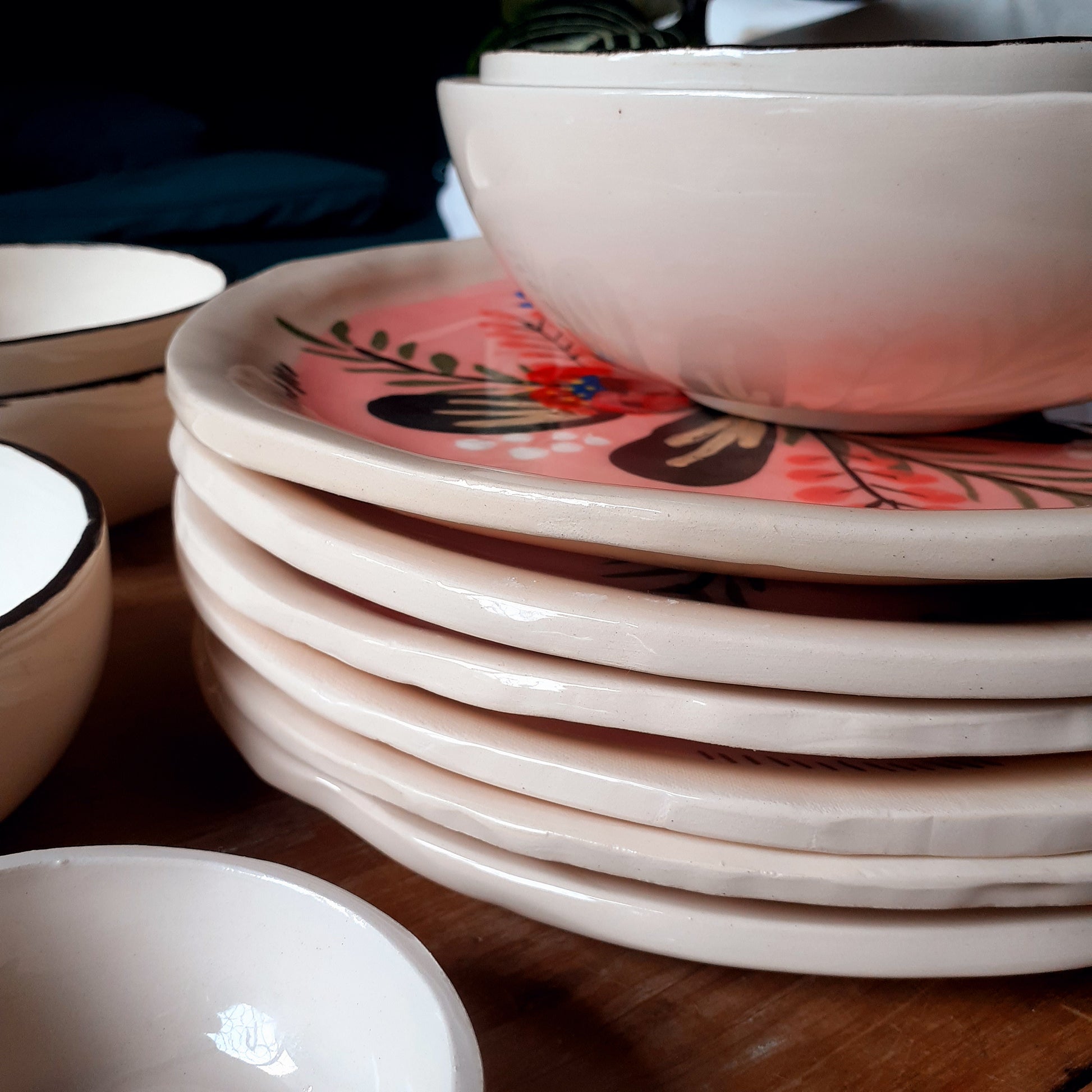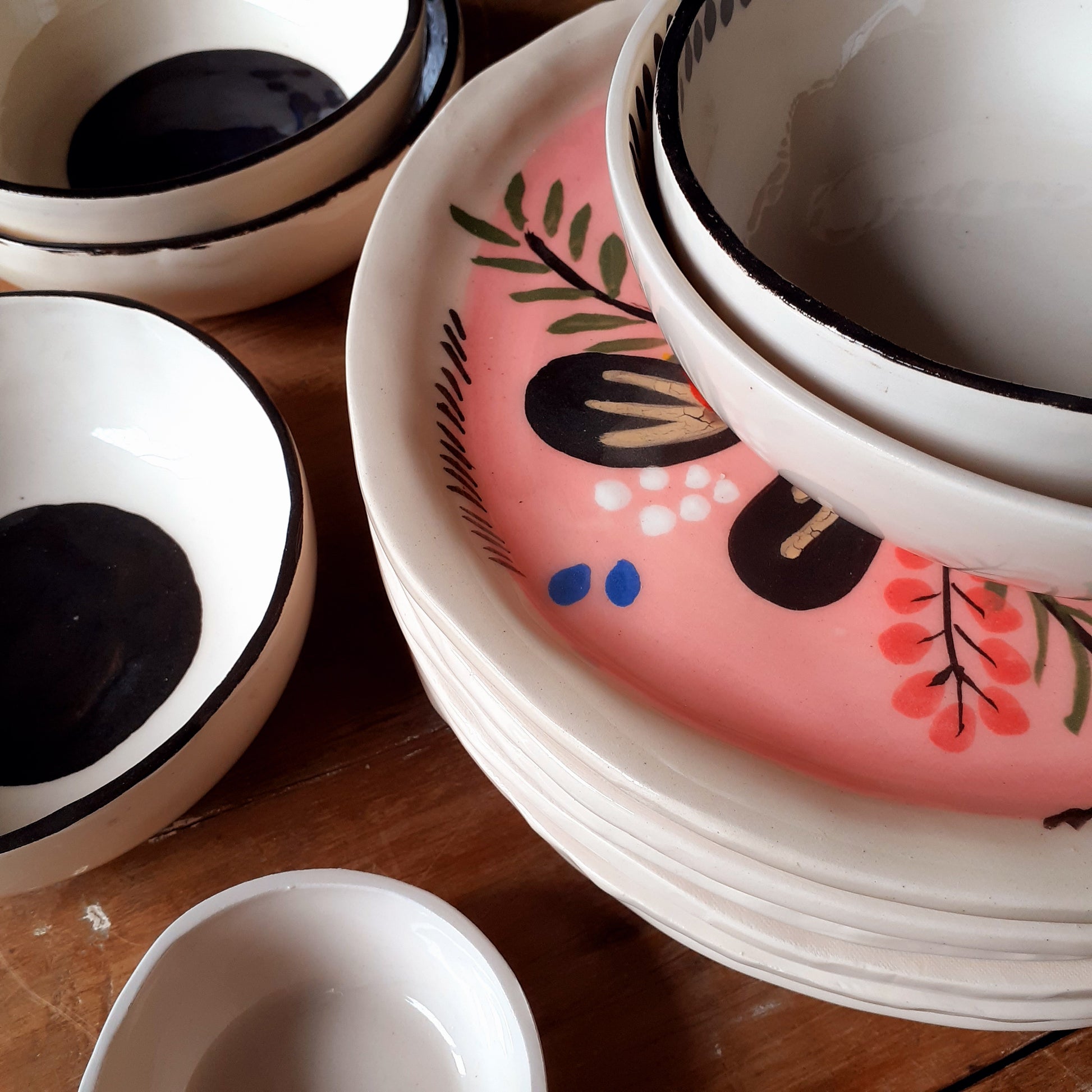 Utilizo arcilla, pigmentos y esmaltes sin plomo, todos aptos para alimentos.